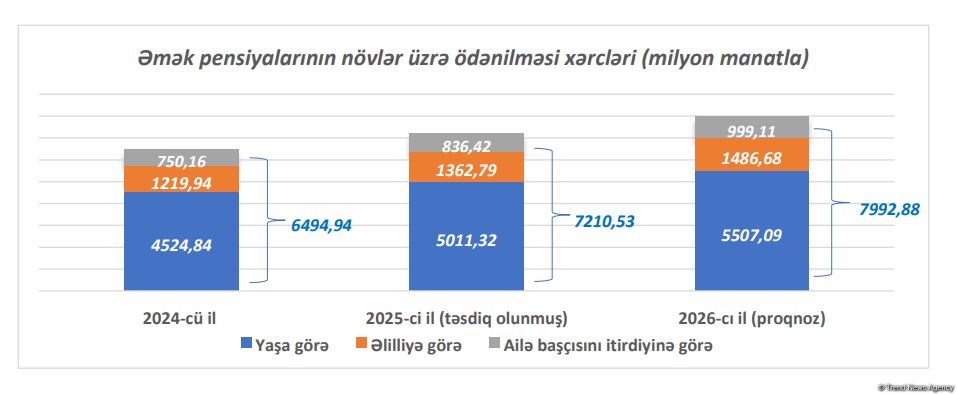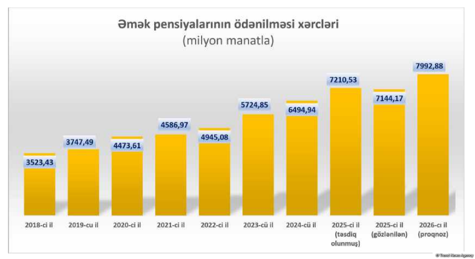 2026-cı ildə əmək pensiyalarının ödənişi üzrə xərclərin proqnoz göstəricisi (cəmi 7992,88 mln. manat) 2025-ci ilin təsdiq edilmiş proqnoz göstəricisinə nisbətən 10,85 faiz və ya 782,35 mln. manat çox nəzərdə tutulur.