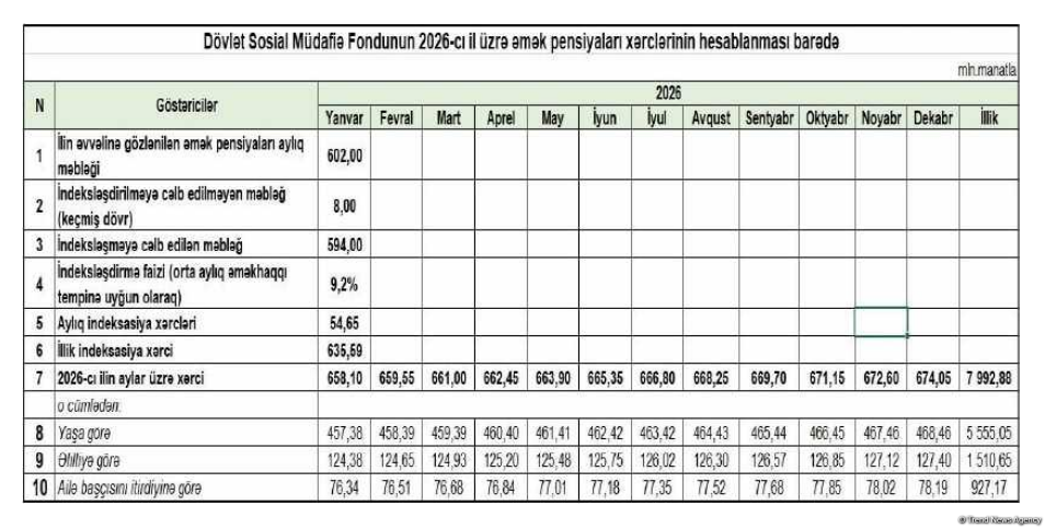 İqtisadiyyat Nazirliyinin rəsmi məlumatı əsasında nominal əməkhaqqı üzrə 2025-ci ildə artım tempinin 9,2 faiz təşkil etməsi nəzərə alındıqda 2026-cı ildə əmək pensiyalarının indeksləşdirilməsi ilə bağlı illik maliyyə yükünün təqribən 635,59 mln. manatadək olması gözlənilir.