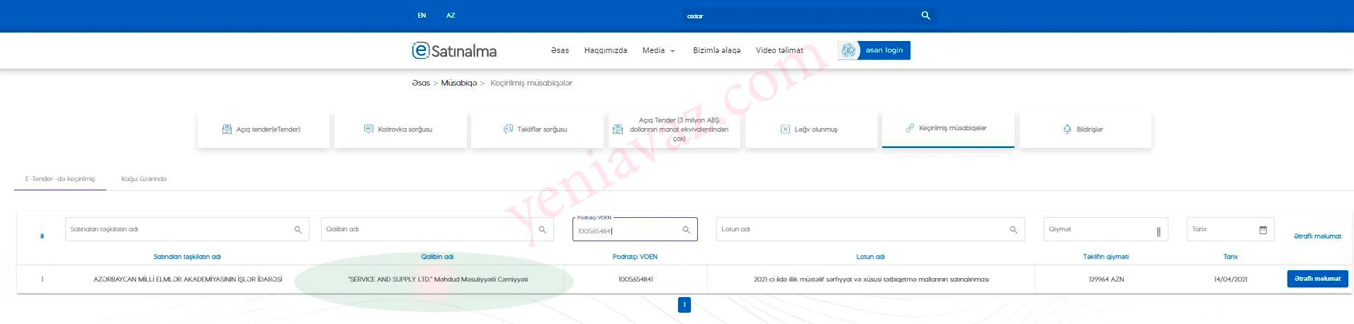 Azərbaycan Milli Elmlər Akademiyasının (AMEA) İşlər İdarəsi tərəfindən keçirilən tender müsabiqəsinin qalibi məlum olub.