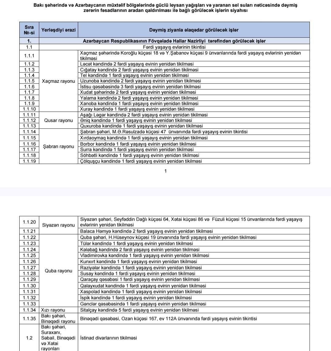 “Aidiyyəti dövlət orqanları (qurumları) tərəfindən mövcud vəziyyətin təhlili aparılaraq, operativ və təxirəsalınmaz tədbirlər nəticəsində fəsadların aradan qaldırılması istiqamətində əməli işlər görülmüş, su basmış ərazilərdən suların çəkilməsi, sel və daşqın sularının maneəsiz ötürülməsi, əhalinin təxliyəsi və təhlükəsizliyi təmin edilmiş, infrastrukturun bərpası və təmir-tikinti işləri həyata keçirilib”, – sənəddə deyilir.